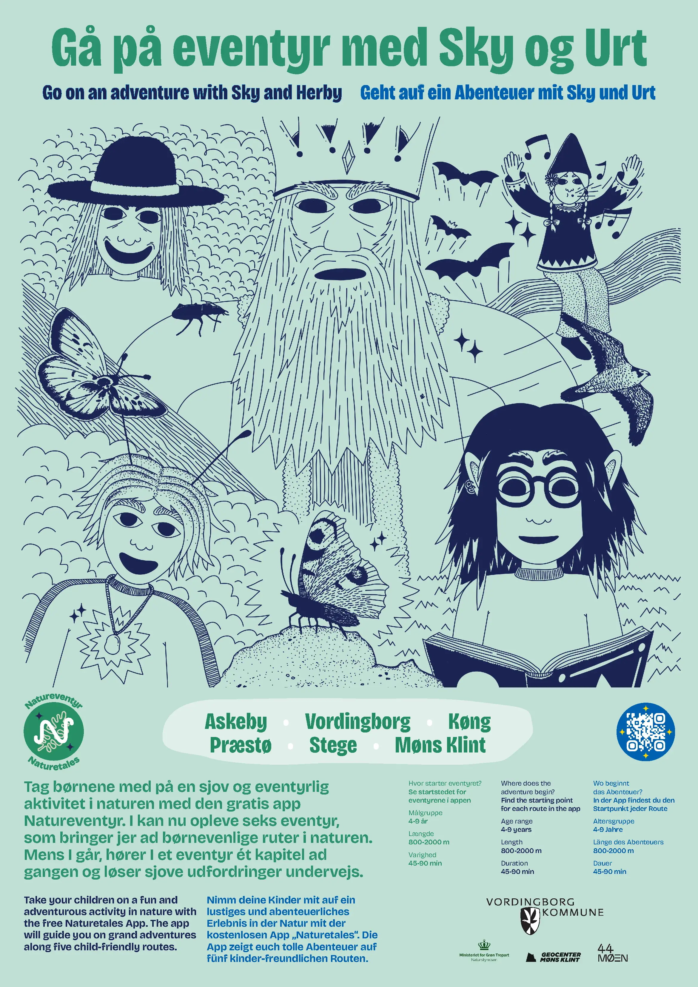 I Vordingborg Kommune har vi seks natureventyr - seks forskellige steder fordelt over kommunens fantastiske natur! Det er seks eventyr om børnene Urt og Sky. Ved første øjekast ligner de helt almindelige børn, men i virkeligheden er Urt og Sky ikke, som børn er flest - de kan nemlig forvandle sig til dyr. Urt til en sommerfugl og Sky til en flagermus.